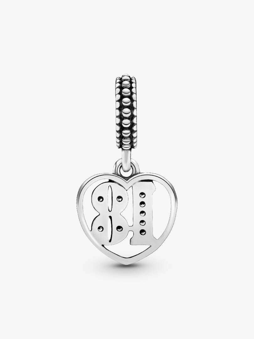 Our coming-of-age style is made to celebrate an 18th birthday. Cast from sterling silver, the beaded bail holds a heart-shaped dangle that is decorated with a stone-embellished number 18, framed with cut-out hearts along