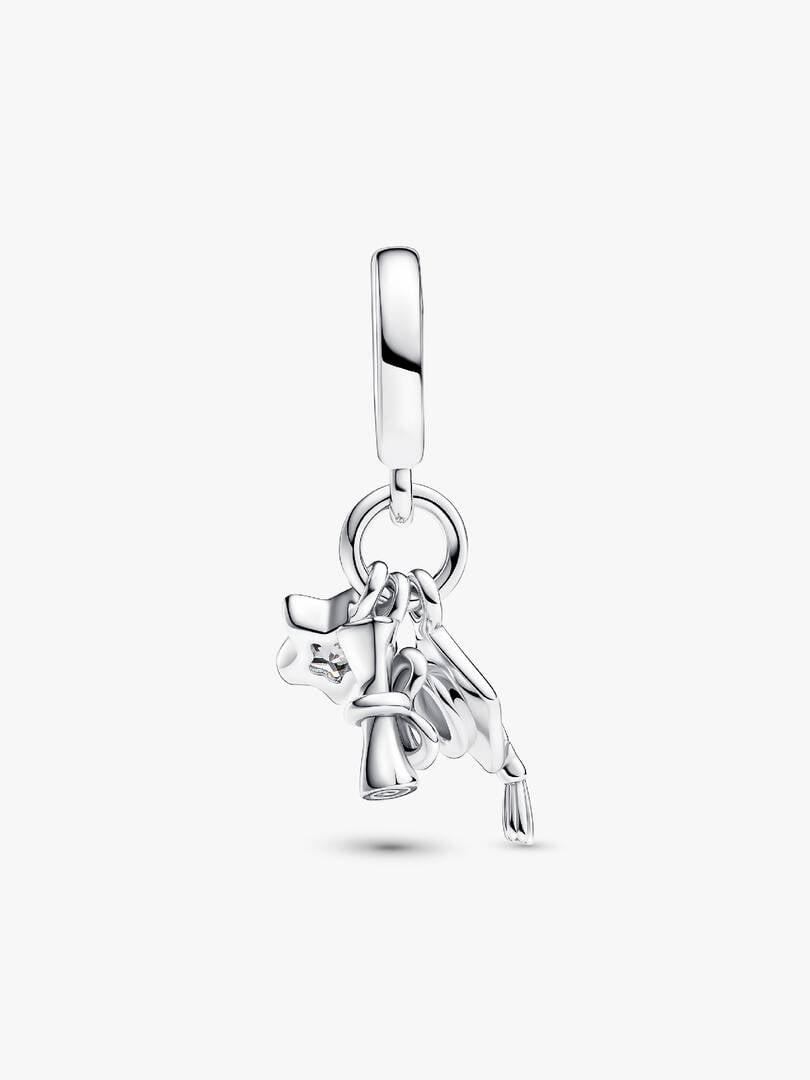 Celebrate your milestone with our 2024 Graduation Triple Dangle Charm, a sterling silver charm capturing the essence of achievement. A star-shaped cubic zirconia gleams alongside a dangling graduation cap with a tasselle
