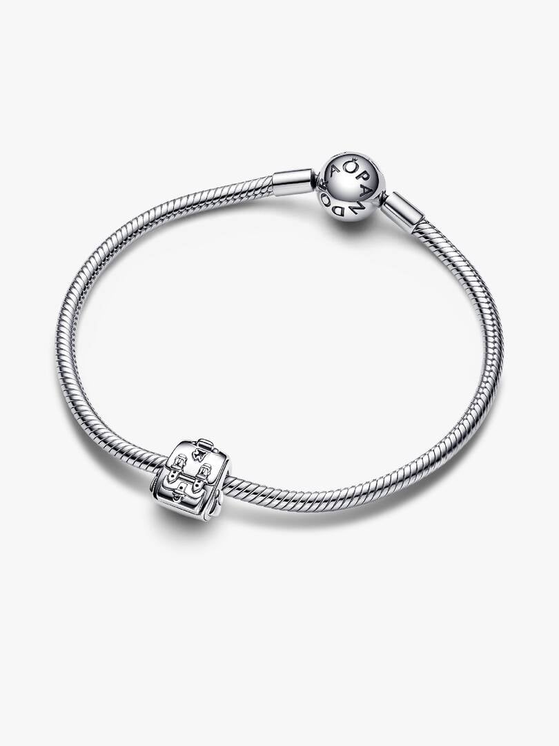 Heed the call for adventure with the Adventure Backpack Charm. A scaled-down sterling silver backpack features realistic details including wraparound straps, handle, buckles and pocket. An airplane symbol is imprinted on