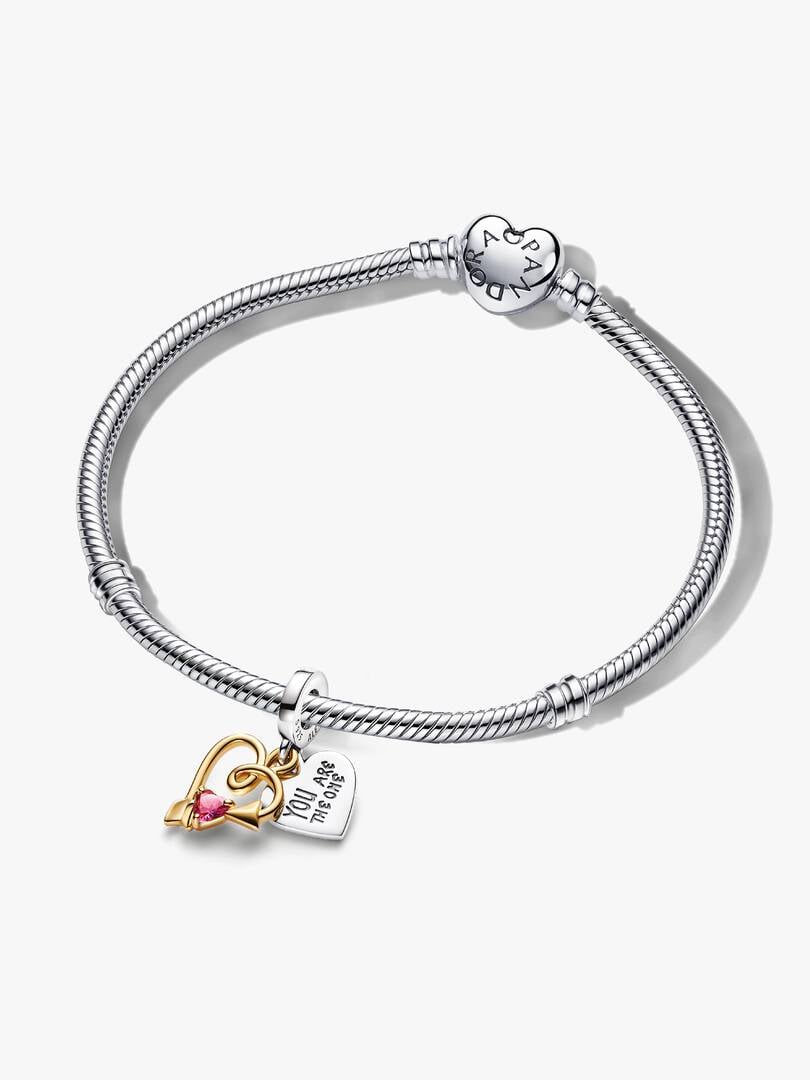 YOU ARE THE ONE” and a blank canvas for personalization. Cupid’s arrow, crafted in 14k gold plating and set with a heart-shaped red stone, adds a touch of romance. The set is completed with the brand Heart Clasp Bracelet, a sterling silver snake chain bracelet featuring a heart-shaped clasp. Wear it as a standalone statement or add your favourite charms to make it uniquely yours.