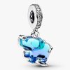 The Blue Murano Glass Elephant Dangle Charm is a colorful ode to a majestic creature. Sterling silver forms an elephant-shaped silhouette around a gradient blue-and-purple Murano glass with a raised ear and a concave rou