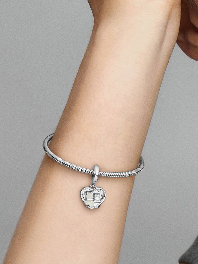 Show off your love for cats with the Cats & Hearts Dangle Charm. Hand-finished in sterling silver, this charm features an open front dangle with two cats whose tails form a heart that’s partly embellished with clear cubi