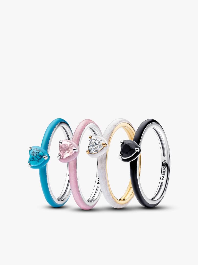Stack your heart out. This set of four heart-shaped rings is crafted in sterling silver and 14k gold plating with colorful enamel and stones — perfect for bold mixing, matching and making your style truly personal.