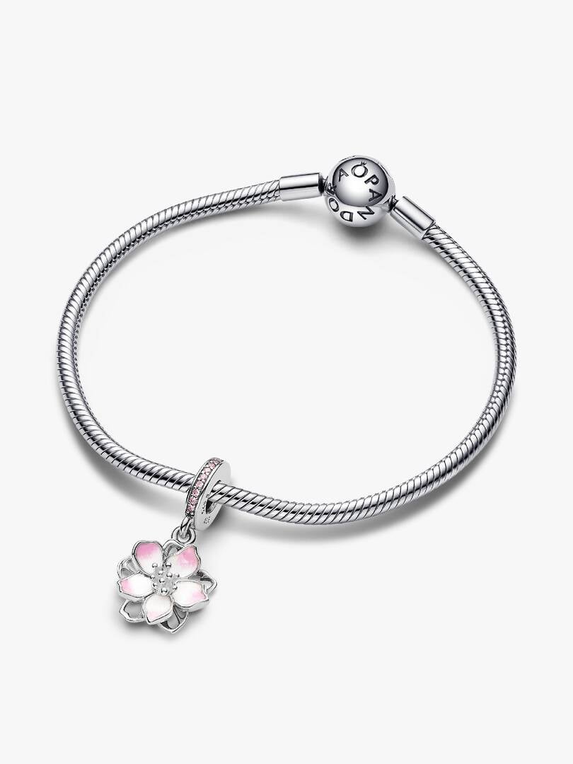 Celebrate the first signs of spring with our sterling silver Cherry Blossom Dangle Charm. Featuring hand-applied pink and white enamel and accented by sparkling pink cubic zirconia, the petals on our cherry blossom rotat