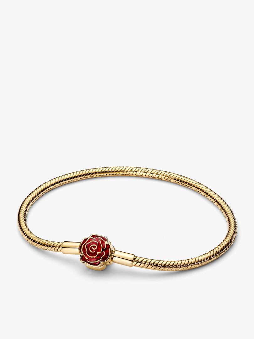 Add an enchanting touch to your look with our bracelet inspired by Disney’s Beauty and the Beast. Crafted in 14k gold plating, it features an enamel rose clasp and is engraved with “Until the last petal falls.”