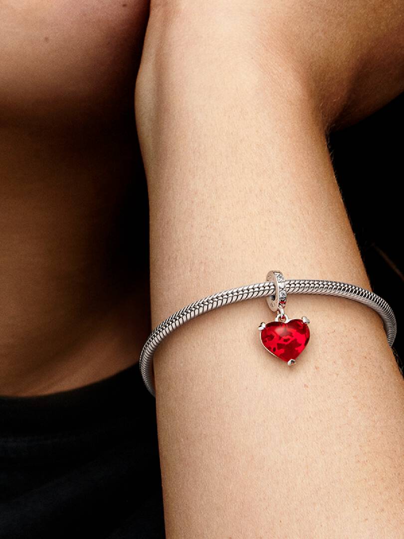 Celebrate love that was meant to be with our Disney Mickey & Minnie Mouse Kiss Red Murano Glass Dangle Charm. Engraved with the message “A forever kind of love”, this sterling silver charm features Disney’s most iconic c