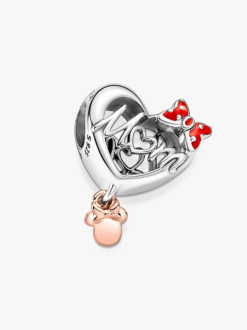 The Disney Minnie Mouse Mum Heart charm is the perfect gift for every Disney mom. Hand-finished in sterling silver with openwork script ‘MUM’ and ‘LOVE’ on either side, the charm features a dangling detail in 14k rose go
