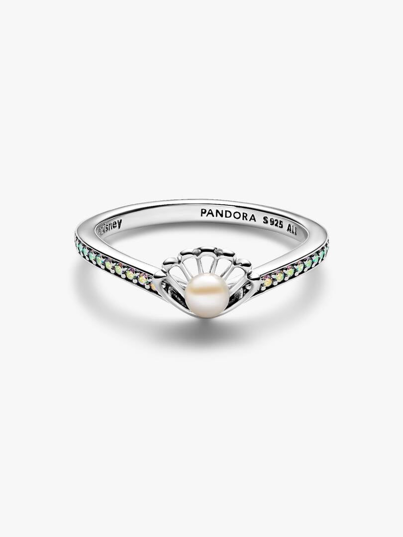 Complete your collection with this sterling silver ring, inspired by Disney’s Ariel. A unique openwork seashell design showcases a white treated freshwater cultured pearl at its center. A channel of stones along the wish