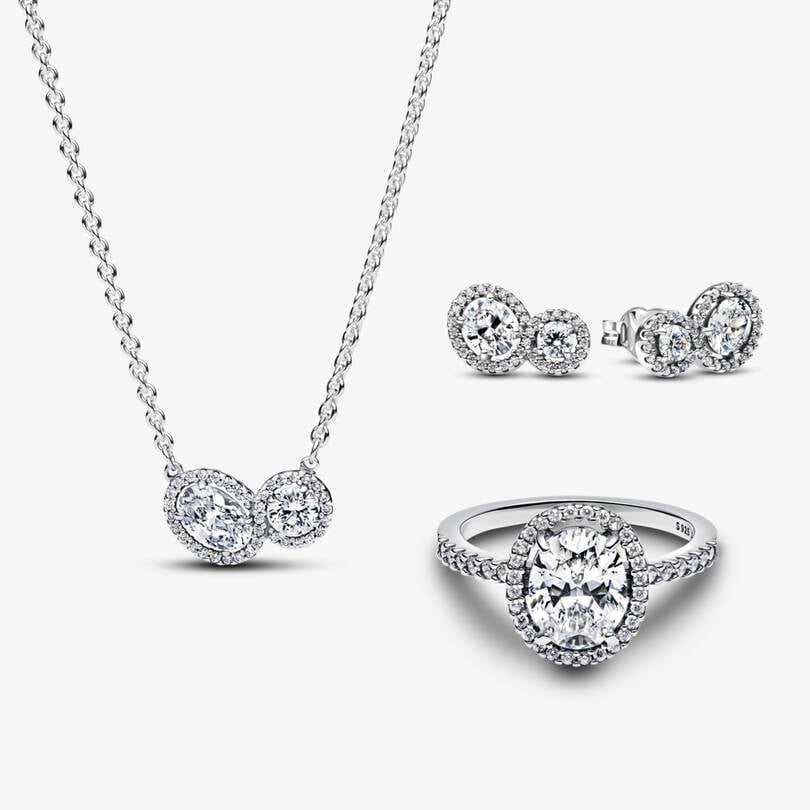 The Embracing Halo Jewelry Set symbolizes the bond between two souls. Featuring sterling silver with round and oval stones, pavé halos, and adjustable details, it’s a timeless celebration of love and connection.