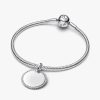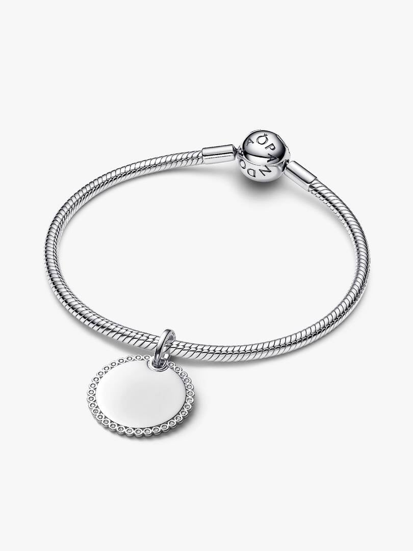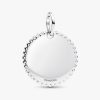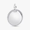 Minimalist style that makes a statement. Add our sterling silver engravable disc pendant, encircled in a halo of sparkling stones, to your collection.