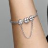 ” The safety chain charm is fitted with swivel ends to prevent it from tangling. Thread one side onto your bracelet before adding charms, connecting the unattached side of the safety chain once your charms are in place.
