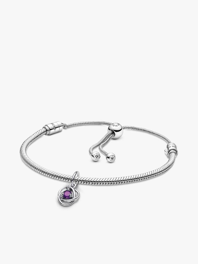 y’s deep purple man-made crystal at the center. Surrounded by three small cubic zirconia stones on the front and a cut-out heart shape on the back for maximum sparkle. This dazzling dangle charm comes on a matching sterling silver brand Moments Snake Chain Slider Bracelet. Capture the symbolism of a February birthday, milestone or anniversary with this precious set. Unconditionally. Infinitely. Be love.