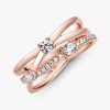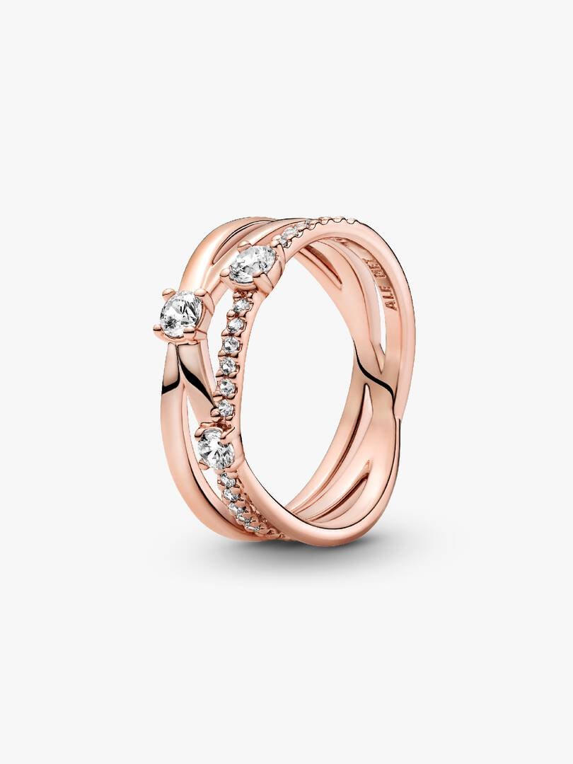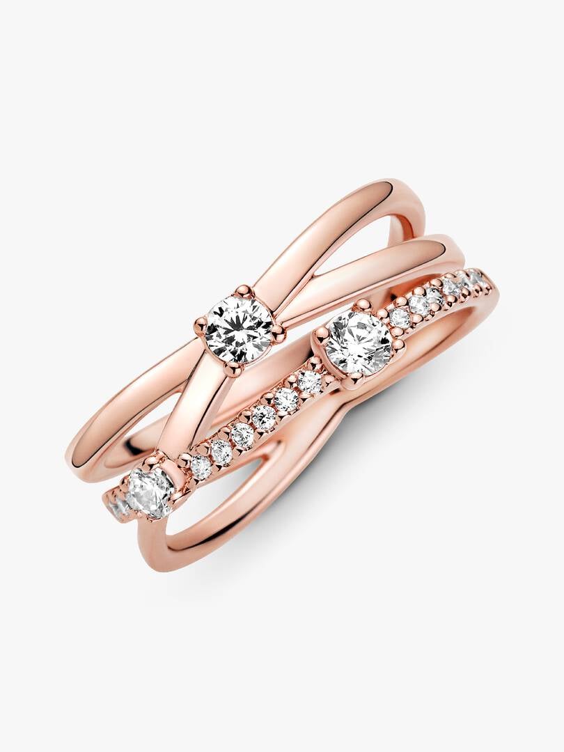 For a classic touch, go for the Sparkling Triple Band Ring. Hand-finished in 14k rose gold plating, this style features three interlinked rings. Small clear cubic zirconia decorate the top of one ring shank, while three