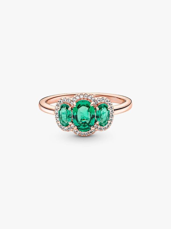 Elevate any look with the Three Stone Vintage Ring. Hand-finished in our 14k rose gold-plated unique metal blend, this ring is set with two oval cut green crystals on either side of a large oval green center stone. A cle