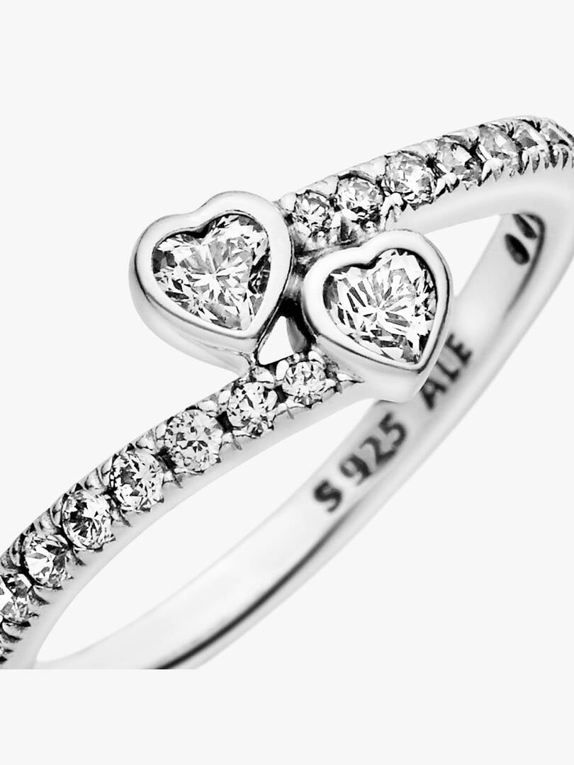Two hearts entwined together make this stunning ring the ultimate symbol of love. Hand-finished in sterling silver, this brand heart ring is set with shimmering cubic zirconia stones and finished with two heart-shaped