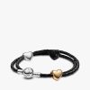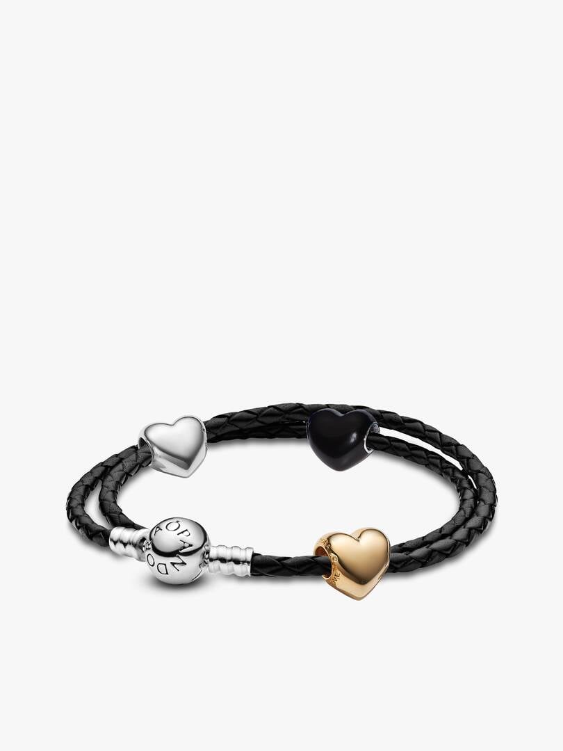 ersonal message), and one in black enamel—each adding its own unique touch. The hearts are beautifully set on a black braided leather bracelet that wraps around the wrist twice, creating a chic layered look. Whether worn on its own or paired with other pieces, this set is a stunning reminder to cherish and celebrate every moment of love.
