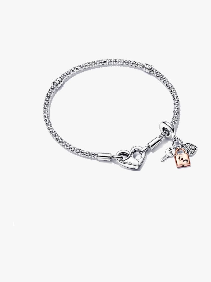 th an infinity symbol detail. It can be styled with up to 14-18 charms or dangle charms on the three sections divided by the two threaders. Paired with the bracelet is a hand-finished two-tone triple dangle charm with key, padlock and heart motifs. The sterling silver key is engraved with the words “The key” and the 14k rose gold-plated padlock features the engraving “To my”, referencing the sterling silver heart charm embellished with pavé. A keyhole-shaped clear cubic zirconia adds sparkle. Give this set to the one who holds the key to your heart – whether that’s yourself or someone else.