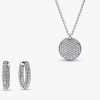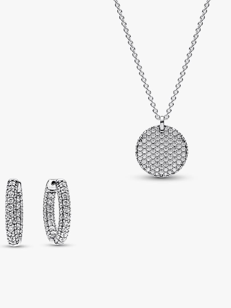 Stunning look featuring a whole lot of shine. This round pendant necklace and hoop earring set is perfect for a night out with the girls.