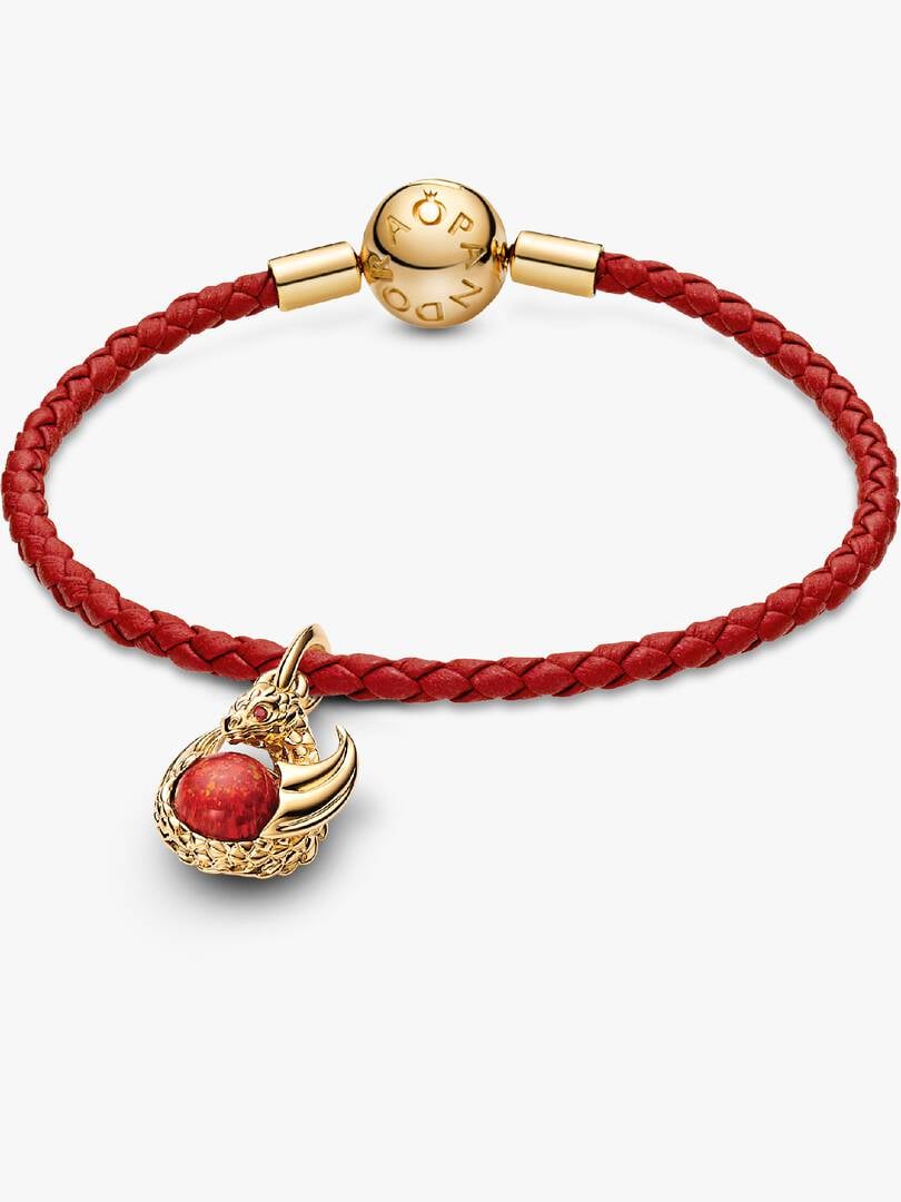Game of Thrones dragon in 14k gold-plated metal featured on the brand Moments Red Woven Leather Bracelet. Collect your way through Westeros with this perfect bracelet set.