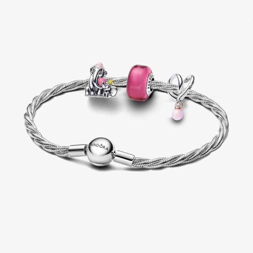 The Precious Mom Charm Set celebrates the beauty of motherhood. Featuring the Disney Dumbo & Mom charm, a Two-tone Wrapped Heart with a pink opal, and a colorful Pink Mini Murano Glass charm, the perfect gift for Mom.