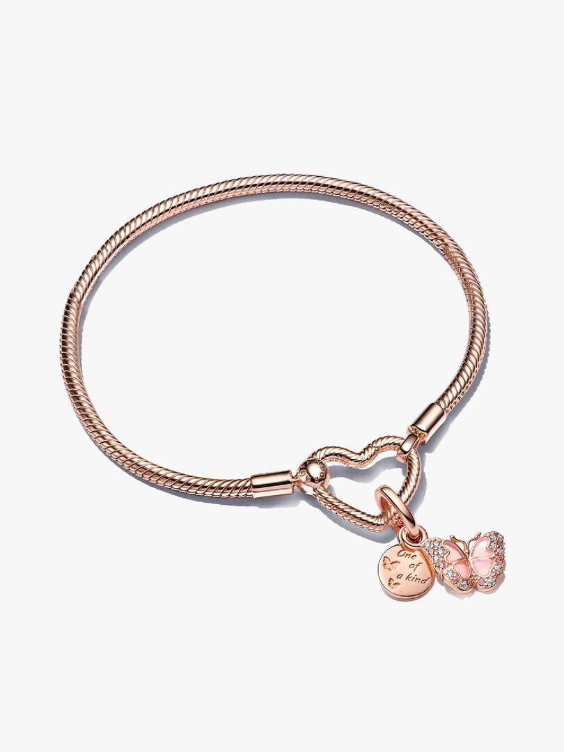 Embody the beauty of change, personal growth and positive transformation with a bracelet set that’s truly one of a kind. The brand Moments Heart Closure Snake Chain Bracelet, hand-finished with 14k rose gold plating, g