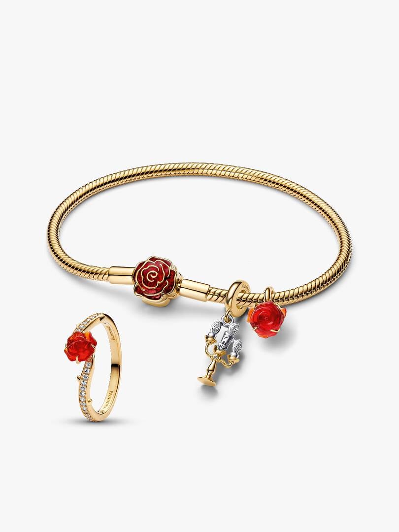 Be our guest. Step into the magic of Disney’s Beauty and the Beast with this regal set featuring a bracelet, two charms and a rose ring. Crafted in 14k gold plating and Murano glass, it’s fairytale style redefined.
