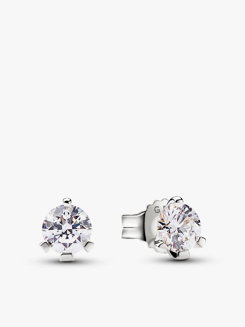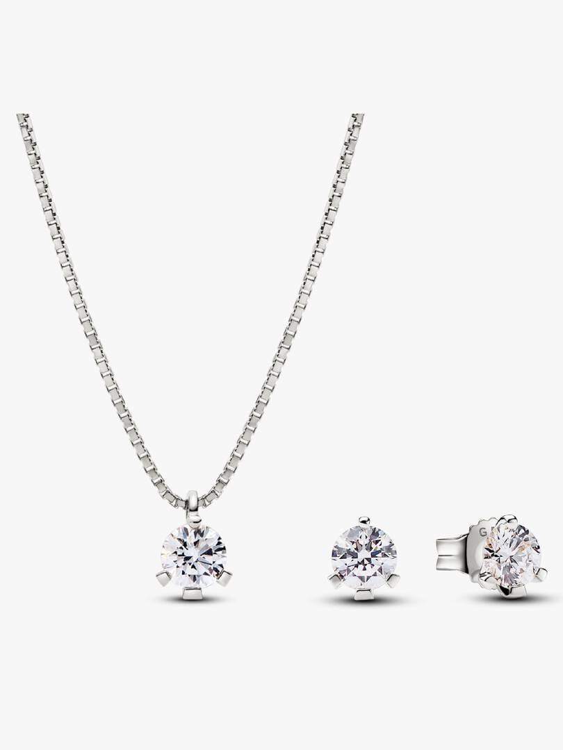 round brilliant excellent cut lab-grown diamond set in 14k white gold. An asymmetrical prong setting frames the stone and is attached to the chain with a hidden jump ring, making the pendant appear to float on the neckline. The 14k white gold necklace chain is adjustable to two lengths. The matching earrings feature a 0.25 carat round brilliant excellent cut lab-grown diamond in each earring, with a total carat weight of 0.50. Wear this beautiful set as a symbol of the unique light within all of us.