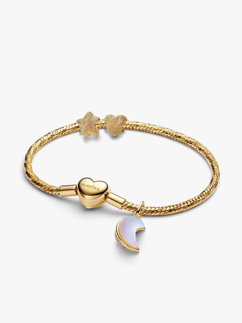 Add a celestial touch. This set includes a 14k gold-plated snake chain bracelet with an engravable heart clasp, two textured mini charms, and our Sparkling Crescent Moon Dangle Charm.