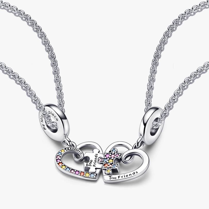 he Puzzle Piece Hearts Splittable Friendship Dangle Charm is designed with blue, orange, yellow, purple and pink stones and microbeads on half of a heart outline, “True Friends” engraved on a polished puzzle piece, and “My Missing Piece” engraved on one side of the bail.