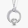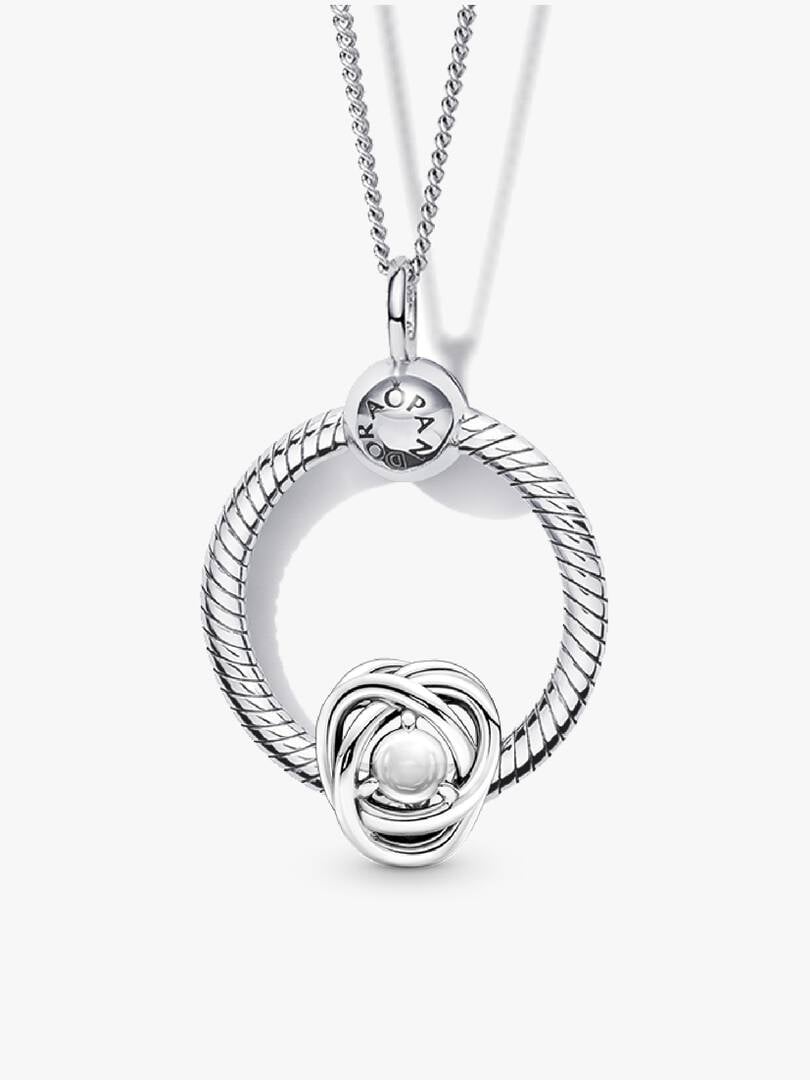 This delicately dazzling April Necklace Set comes with a Classic Cable Chain Necklace in sterling silver, a snake-chain patterned brand Moments Small O Pendant, and a Clear Eternity Circle Charm with a cabochon-cut cle