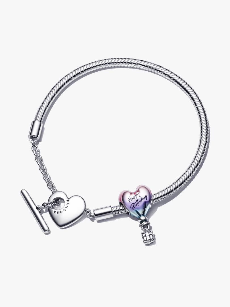 d a touch of realism. A small 3D gift box dangles from the balloon with ribbon detailing. The Happy Birthday Hot Air Balloon Charm comes on a brand Moments Heart T-Bar Snake Chain Bracelet featuring a heart-shaped disc with an open circle on one side to loop the T-bar through to open and close. The perfect gift for adventure seekers.