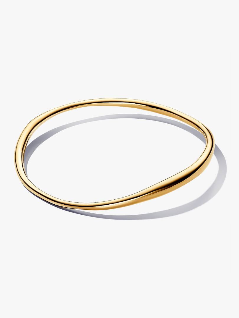 The Organically Shaped Bangle is a sleek style essential. This 14k gold-plated bangle features a wavy profile that varies in thickness, creating a sense of movement and a subtle undulating effect. Inspired by the natural