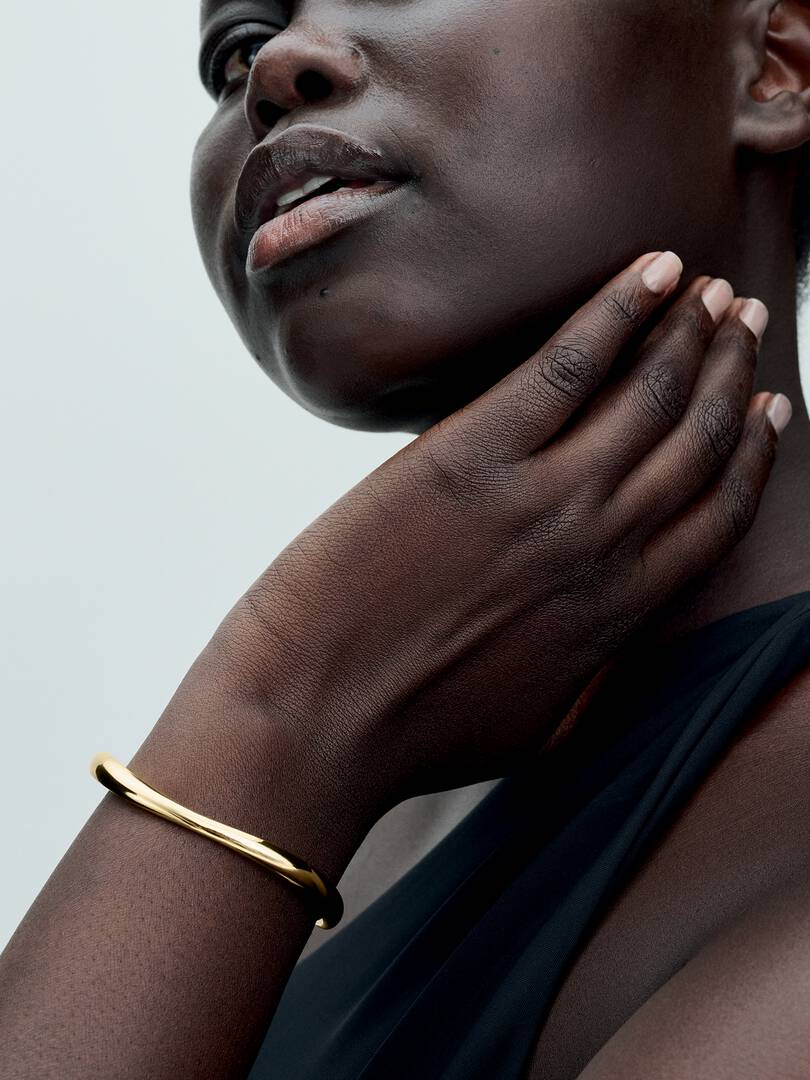 The Organically Shaped Open Bangle is a modern style essential. This 14k gold-plated bangle features a wavy profile that varies in thickness. Inspired by the natural lines and curves found in nature, this modern piece is
