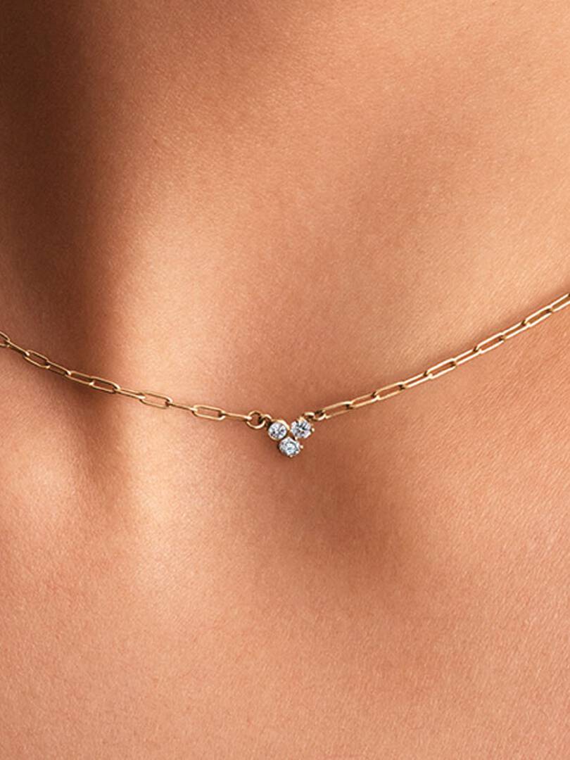 Elevate your everyday look with this refined necklace, featuring a trio of lab-grown diamonds. Crafted from solid 14k gold, this adjustable piece is versatile for layering or as a standalone accent. The delicate cluster
