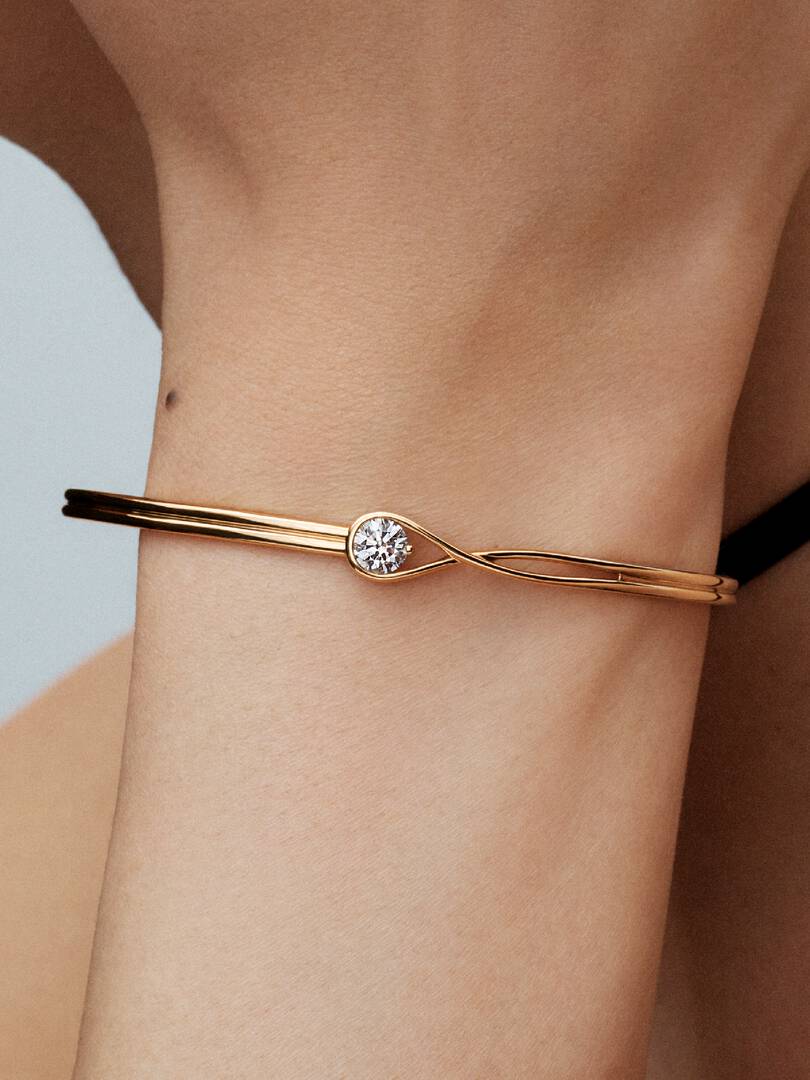 ty motif, which flows around the stone as if it’s ethereally suspended in mid-air. Our closed bangle design features a slender profile and functional hinge and clasp mechanisms, promising security and comfort. We recommend handling it with extra care to ensure optimal functionality and longevity. Let yours shine alone or inspire an elevated everyday stack. Each brand Lab-grown diamond is treated with a post-growth color enhancement called annealing.
