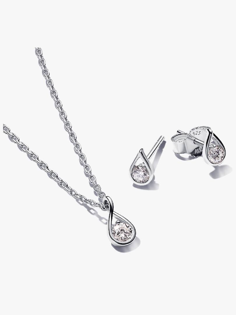 Infinite in design and possibility, this sterling silver curated set is simply stunning. A radiant 0.15 carat lab-grown diamond floats in a modern infinity pendant on a matching sterling silver necklace. Pre-styled with