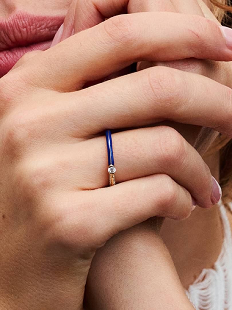 Add sparkle and color to your stack with our brand ME Pavé & Blue Dual Ring. A round brilliant-cut cubic zirconia sits between a row of shimmering pavé and hand-applied transparent glossy blue enamel covering 2/3 of th