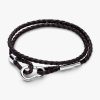 Earthy meets edgy in the brand Moments Brown Braided Double Leather Bracelet. Braided brown leather wraps around twice and closes with a sterling silver carabiner clasp that has a brand logo engraved on both sides. A
