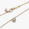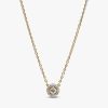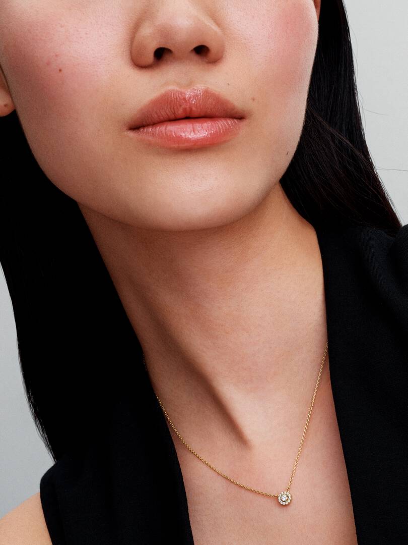Classic meets contemporary in this Round Pavé Halo Pendant Necklace in 14k gold plating. The necklace features a fixed pendant, where a halo of pavé cubic zirconia surrounds a larger stone, raised for extra dimension. De