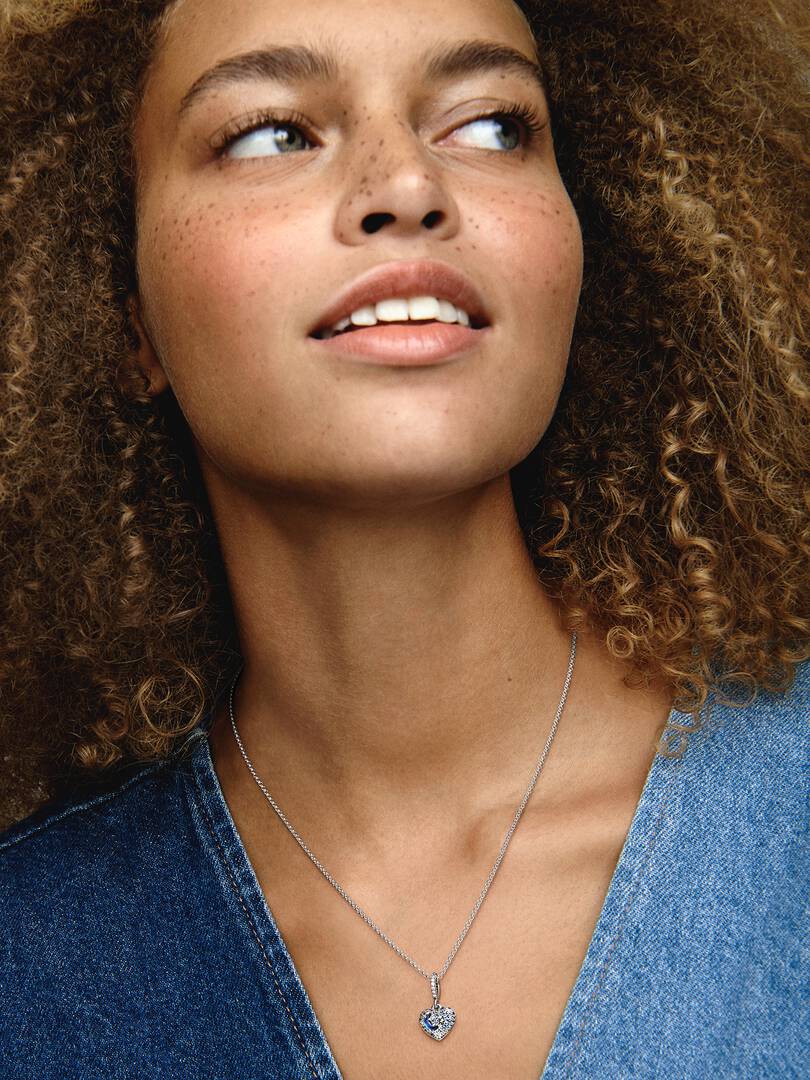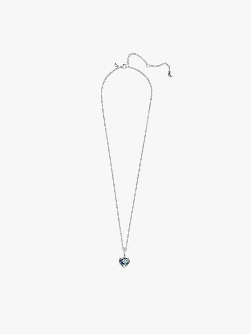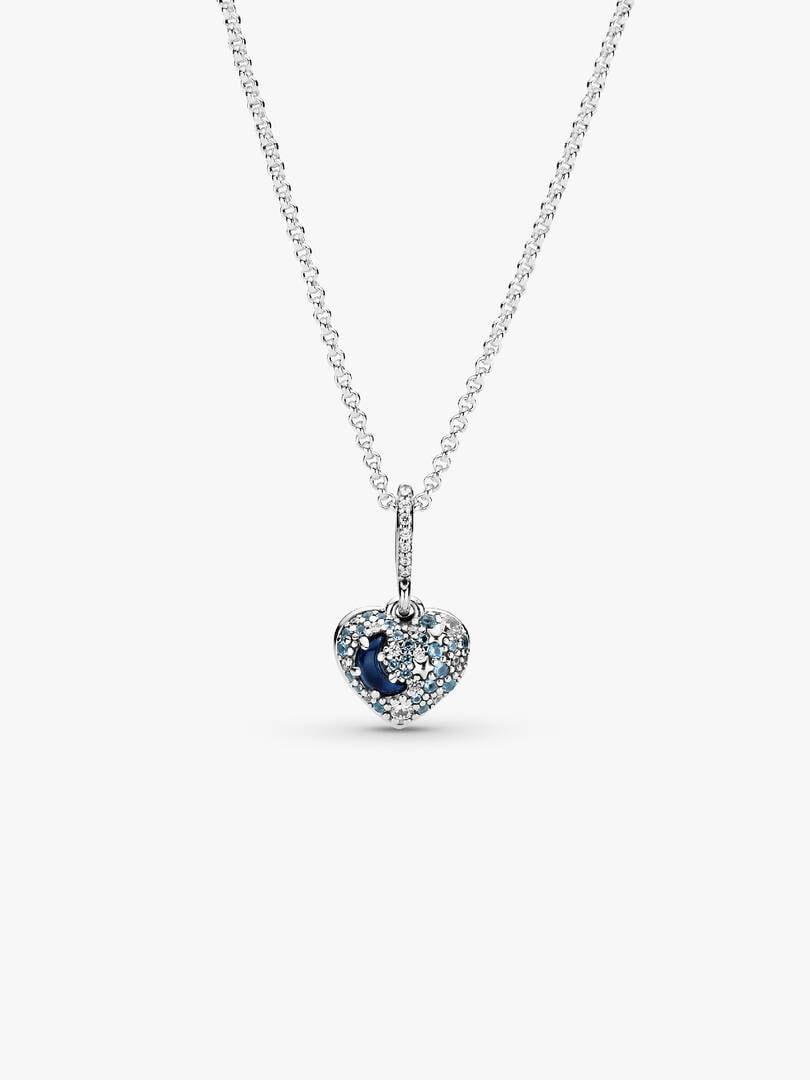Celebrate the beautiful night sky with the Sparkling Blue Moon & Stars Heart Necklace. Hand-finished in sterling silver, this heart-shaped pendant is decorated with blue stones, silver stars and features a half-moon ston