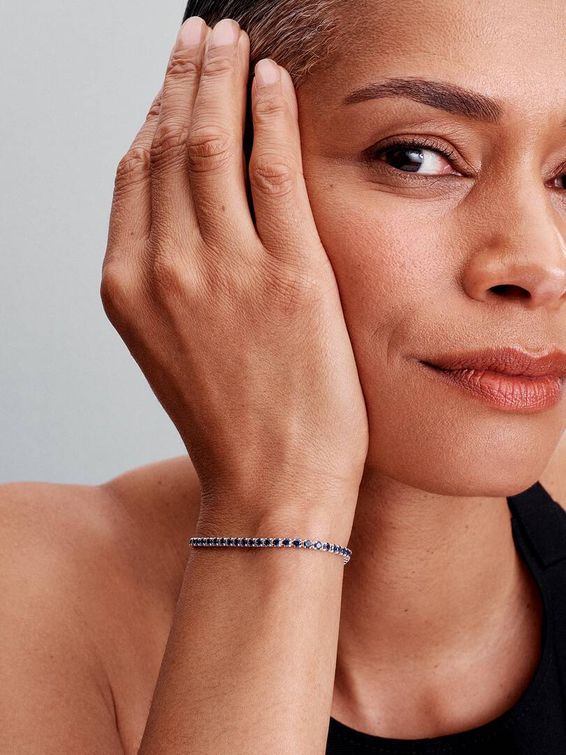 Our reimagined classic tennis bracelet is crafted from sterling silver and features a sparkling row of 34 prong-set round brilliant-cut royal blue man-made crystals. Designed with layering in mind, this is the ultimate p