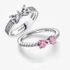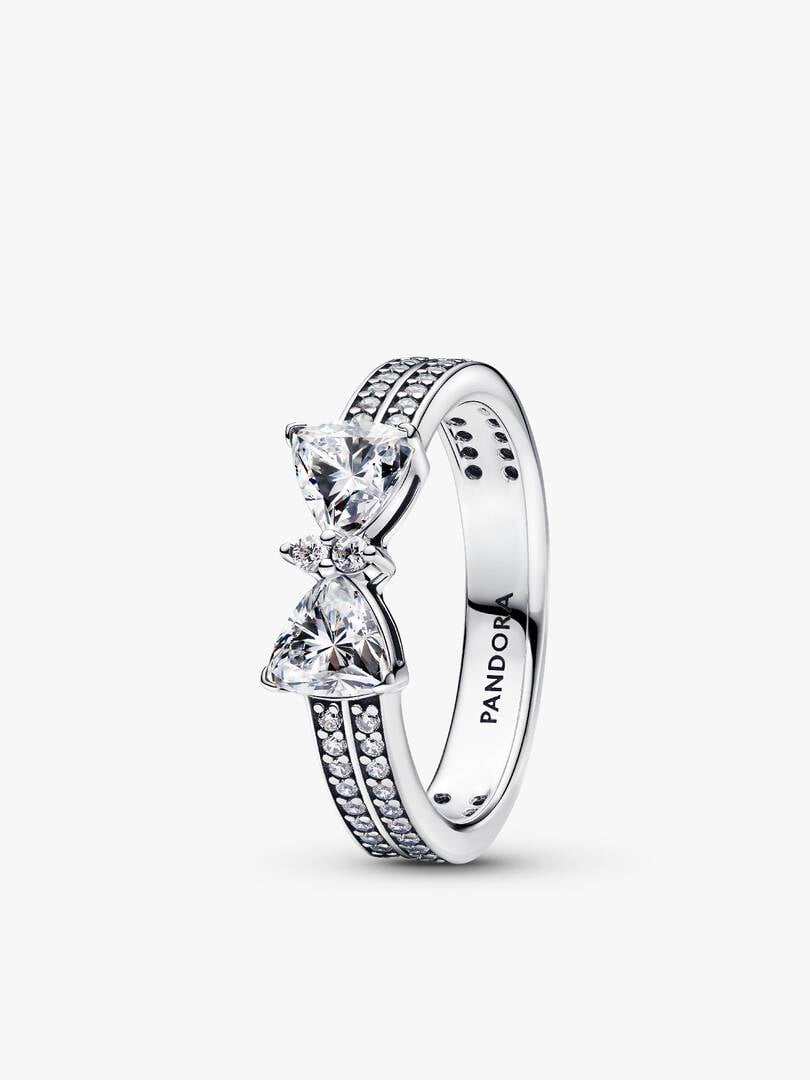 howcases a contemporary bow motif adorned with clear cubic zirconia, with a double row of pavé stones on the band adding extra brilliance. The Sparkling Pink Bow Ring features two prong-set heart-cut fancy pink cubic zirconia stones at its center, symbolizing light and festivity, with a delicate bow motif and a band adorned with 14 bead-set round brilliant-cut clear cubic zirconia. Together, these rings create a stunning set that embodies joy, celebration, and timeless elegance, perfect for gifting to someone special or treating yourself to a touch of luxury.