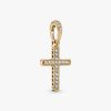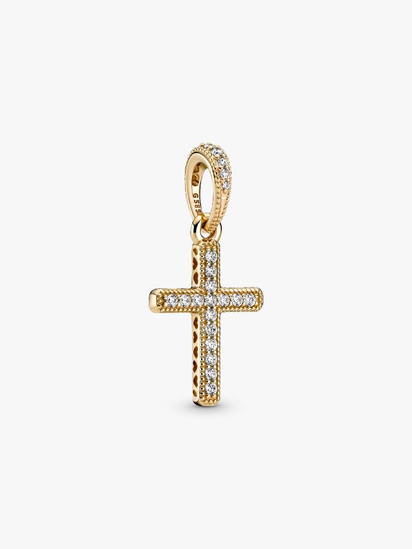 Introduce a classic piece of jewelry to your collection with the Sparkling Cross Pendant. Hand-finished in 14k gold, the front of this design is set with clear cubic zirconia, with a polished reverse side. Cut-out hearts