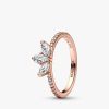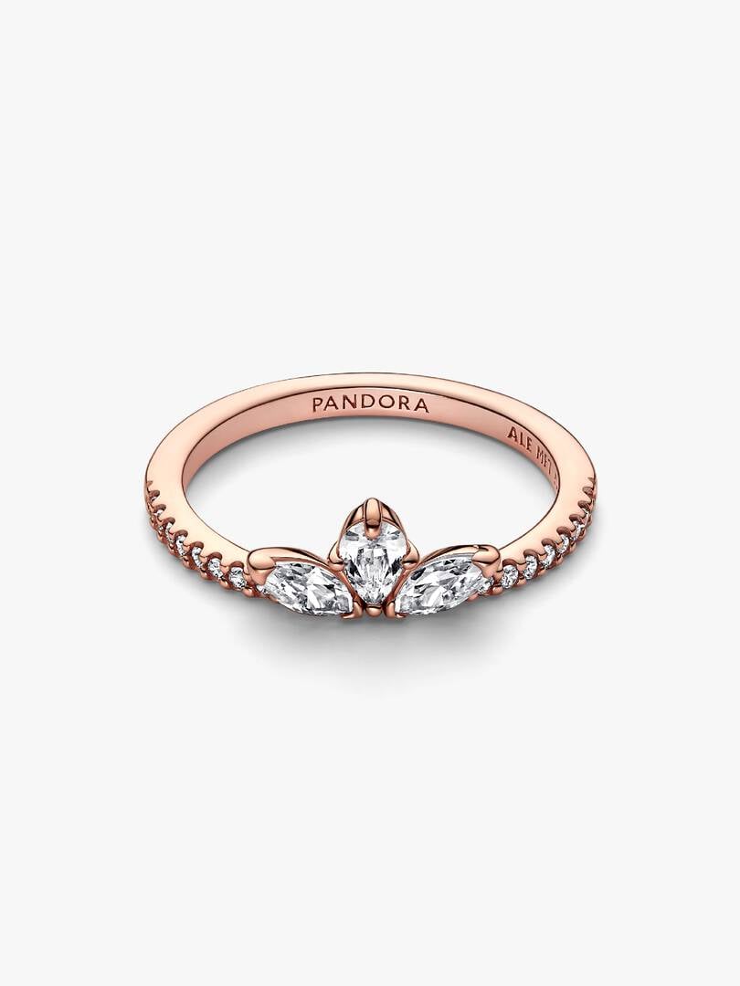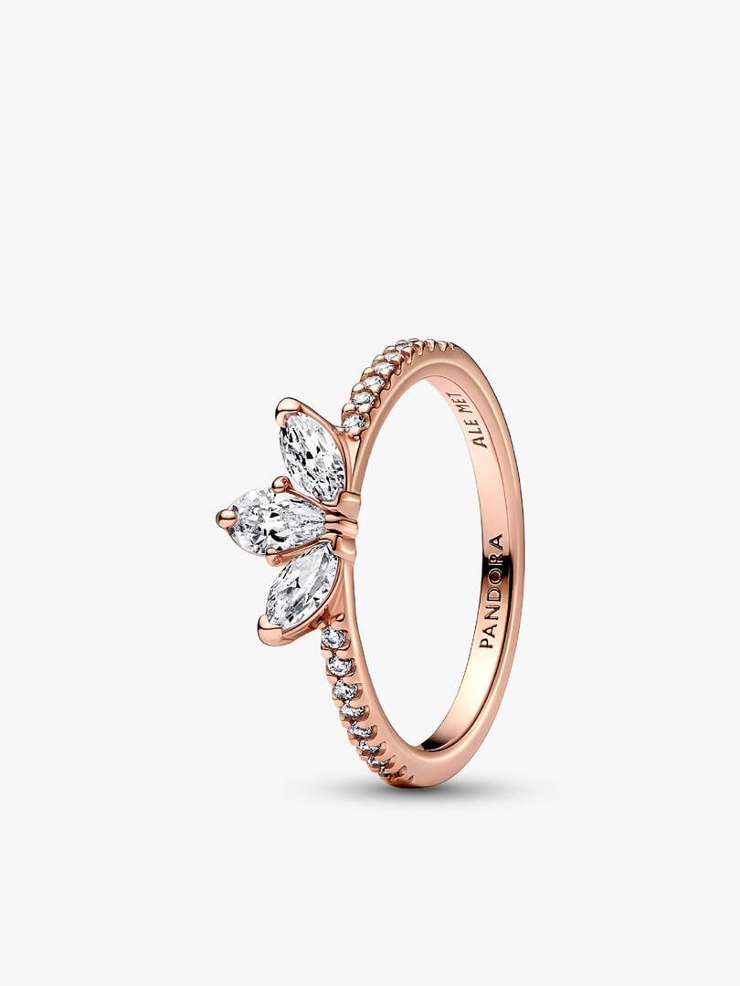 Our Sparkling Herbarium Cluster Ring features three central stones in a petal shape, two marquise-shaped and one pear-shaped. Finished in 14k rose gold plating, this elegant ring is inspired by the beauty of nature, with