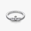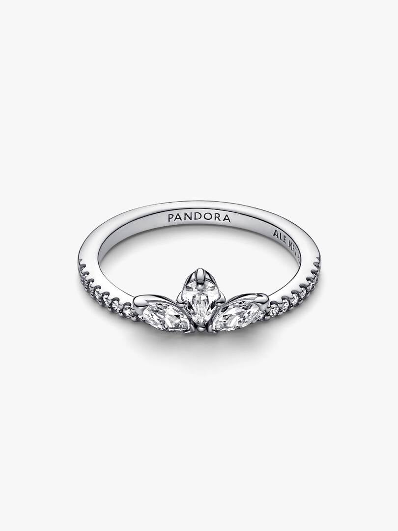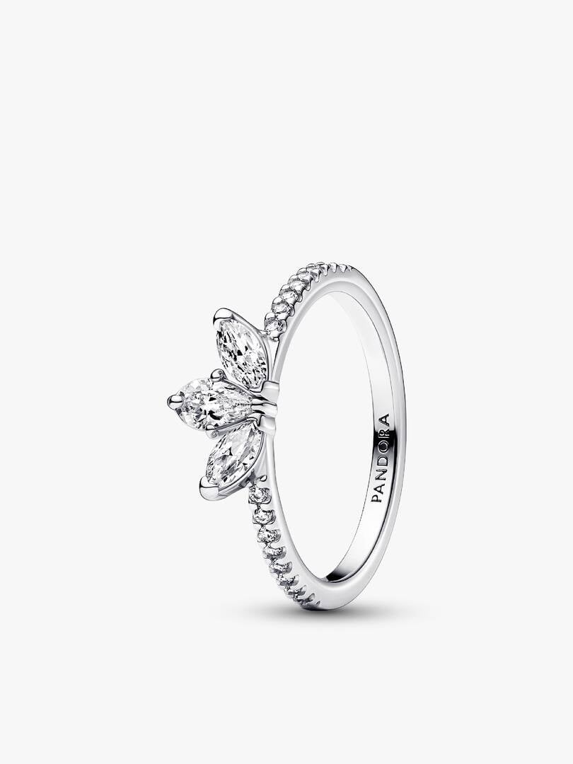 Our Sparkling Herbarium Cluster Ring features three central stones in a petal shape, two marquise-shaped and one pear-shaped. Crafted from sterling silver, this elegant ring is inspired by the beauty of nature, with peta