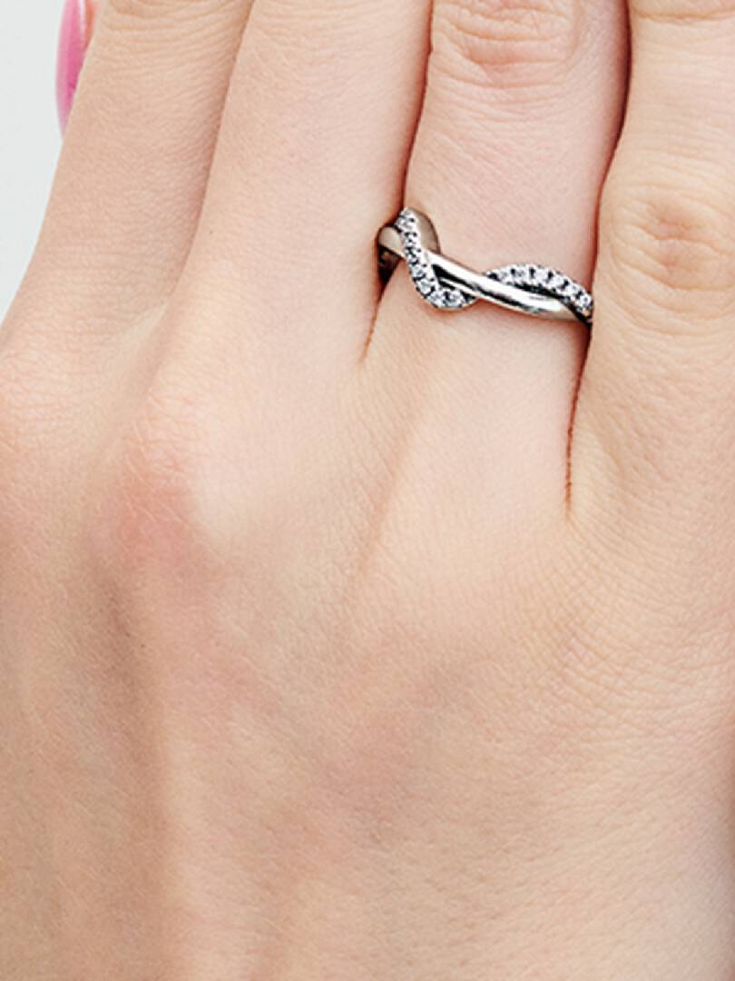 A new wave of stacking. Crafted from sterling silver, our Sparkling Intertwined Wave Ring is inspired by the movement of ocean waves. It features a smooth polished ring band with a wavier band entwined around it, set wit