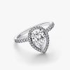 Shine brighter than ever when you wear the Sparkling Pear Halo Ring. This sterling silver ring features one striking pear-shaped stone set slightly above a delicate pavé halo. A V-shaped prong and two claw prongs hold th