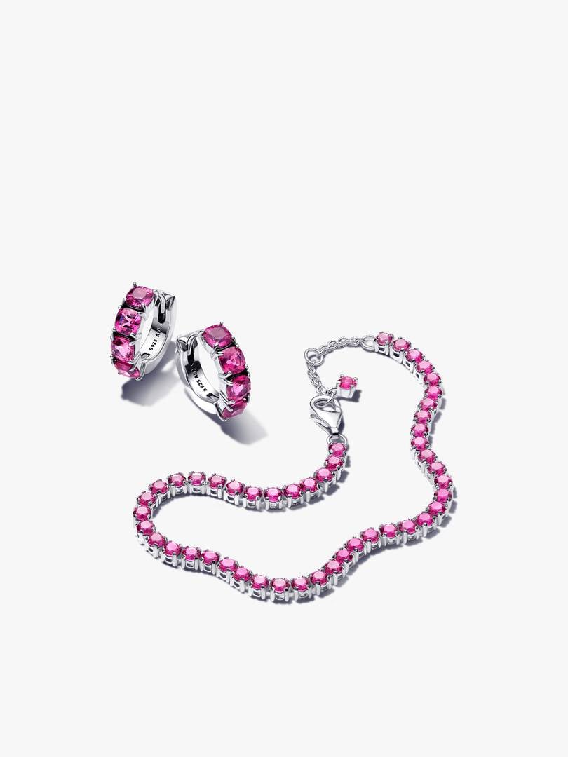 Radiant pink stones bring vibrant energy to this elegant set, featuring a sleek bracelet and timeless hoops. Whether styled alone or layered, it’s a striking expression of individuality.