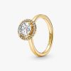 Classic yet modern, the 14k gold-plated Sparkling Round Halo Ring features a round center stone encircled by a halo of brilliant-cut clear cubic zirconia pavé. The brand logo is engraved on the inside of the shank. A t