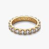 Make a classic statement with the Sparkling Row Eternity Ring. Hand-finished in 14k gold-plated sterling silver, this eternity ring features a band inlaid with sparkling clear cubic zirconia. The design looks equally bea